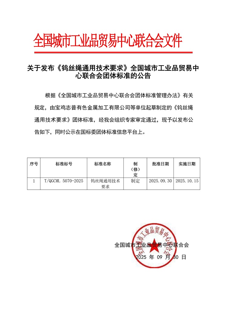 关于发布《钨丝绳通用技术要求》全国城市工业品贸易中 心联合会团体标准的公告