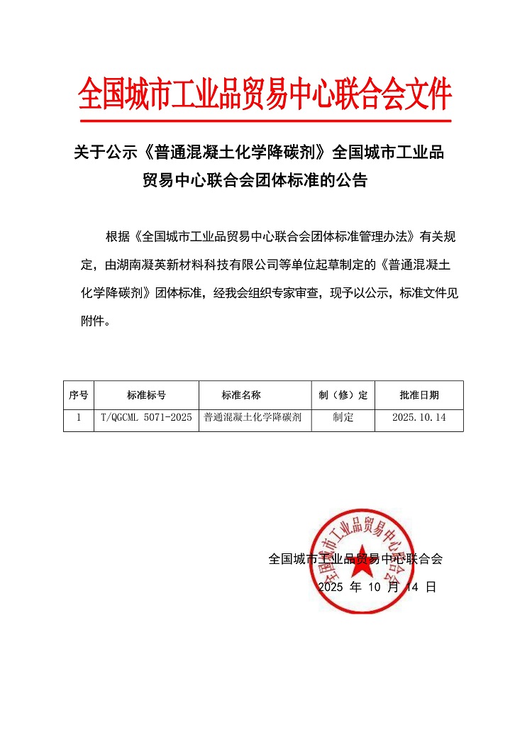 关于公示《普通混凝土化学降碳剂》全国城市工业品贸易中心联合会团体标准的公告