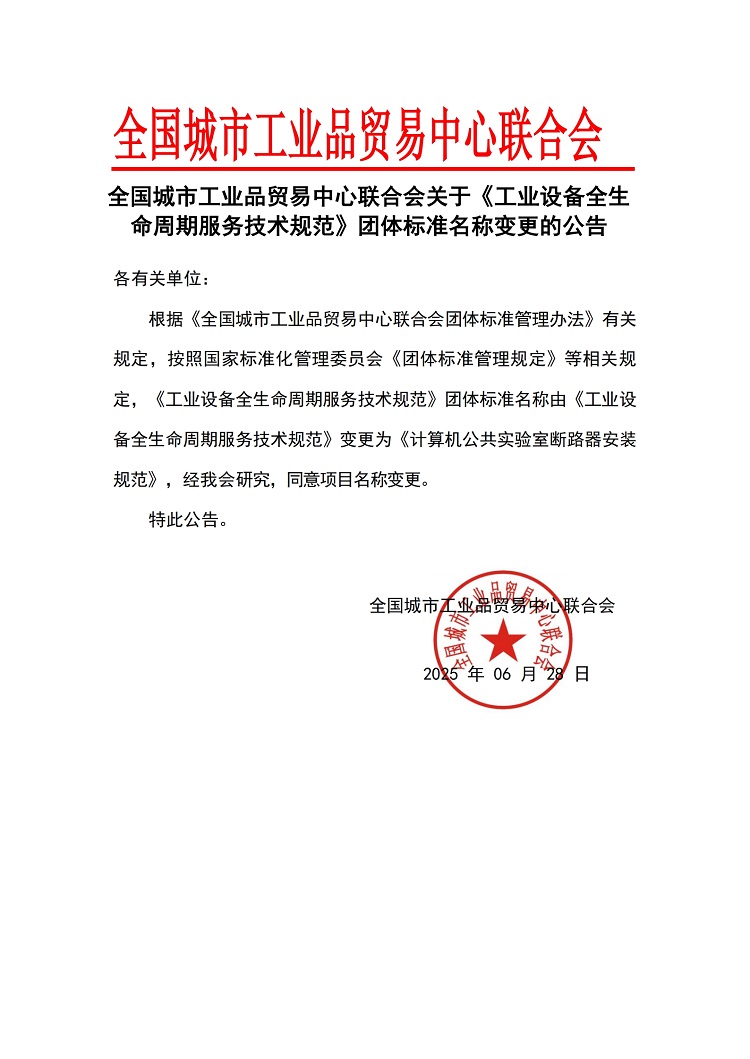 关于《工业设备全生 命周期服务技术规范》团体标准名称变更的公告