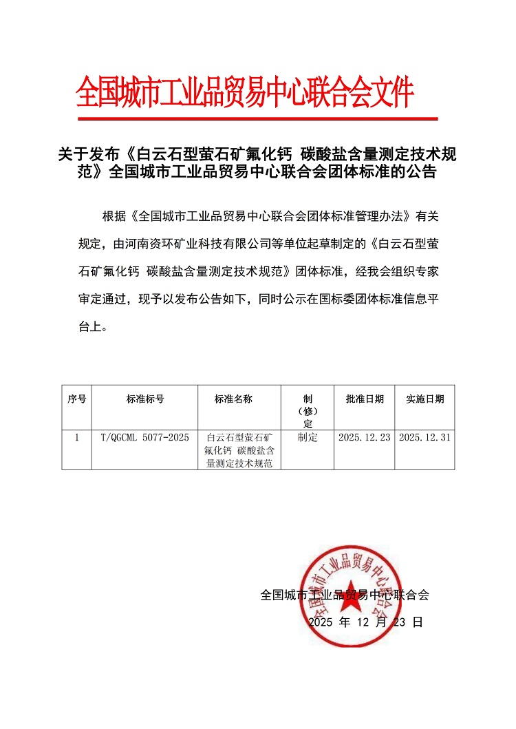 关于发布《白云石型萤石矿氟化钙碳酸盐含量测定技术规范》全国城市工业品贸易中心联合会团体标准的公告