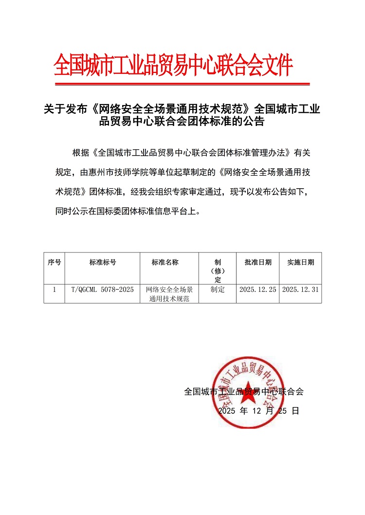 关于发布《网络安全全场景通用技术规范》全国城市工业品贸易中心联合会团体标准的公告