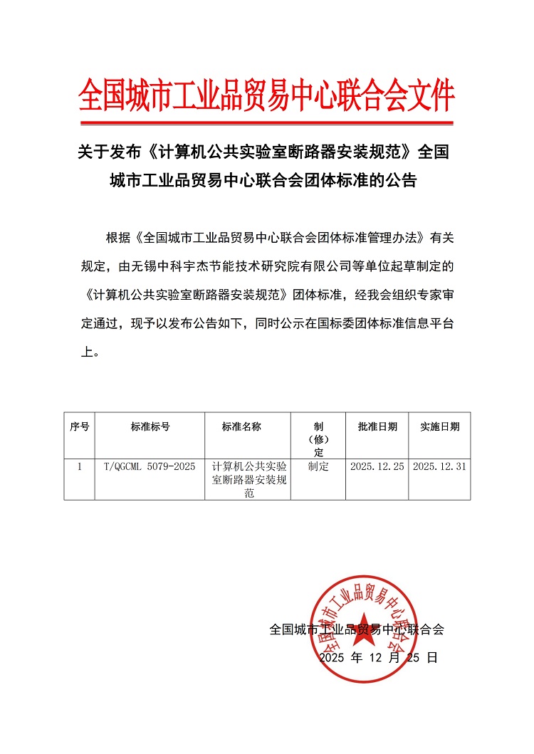 关于发布《计算机公共实验室断路器安装规范》全国城市工业品贸易中心联合会团体标准的公告