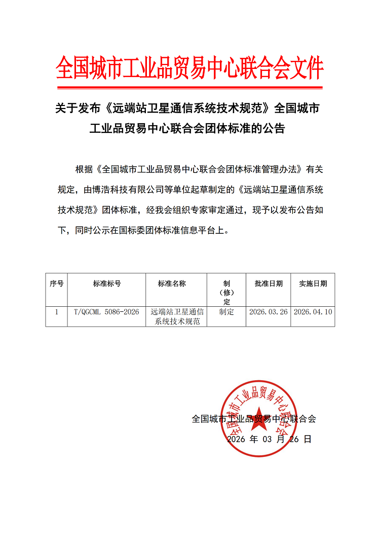 关于发布《远端站卫星通信系统技术规范》全国城市工业品贸易中心联合会团体标准的公告