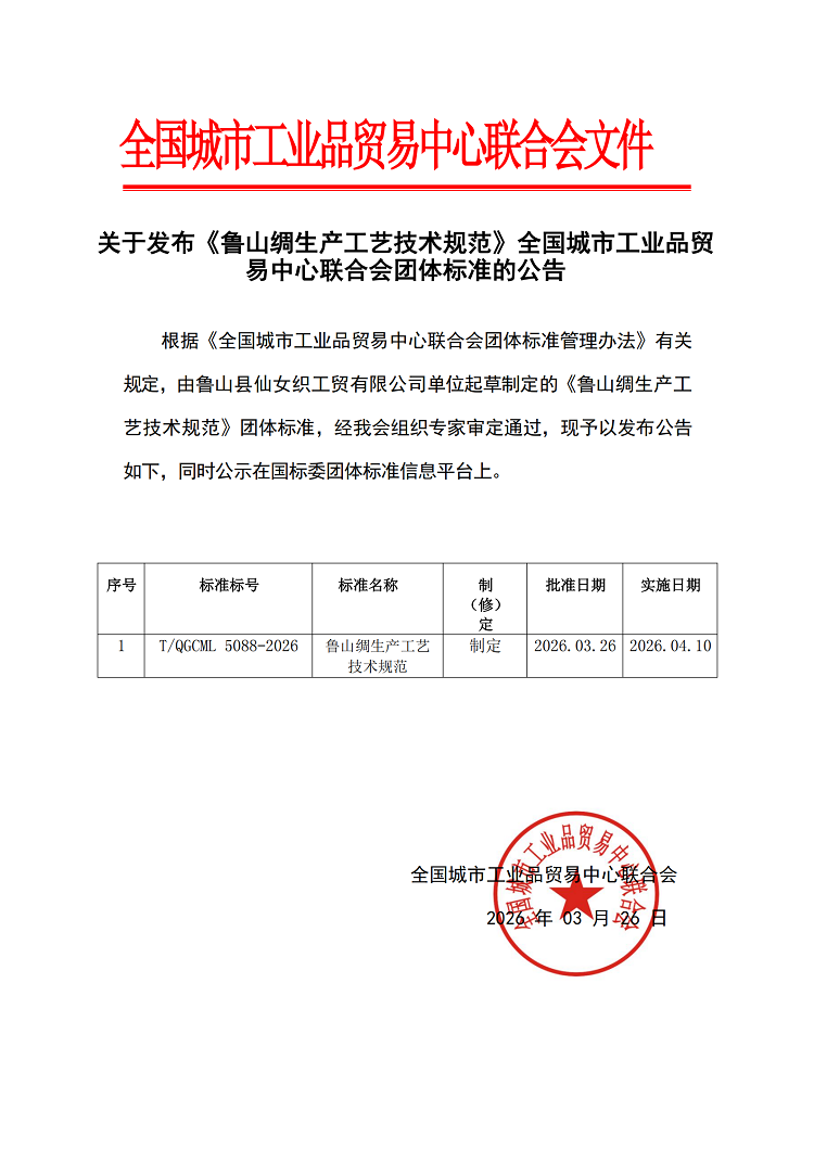 关于发布《鲁山绸生产工艺技术规范》全国城市工业品贸易中心联合会团体标准的公告
