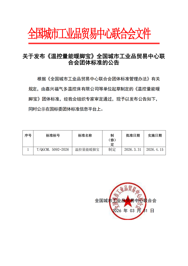 关于发布《温控量能暖脚宝》全国城市工业品贸易中心联合会团体标准的公告